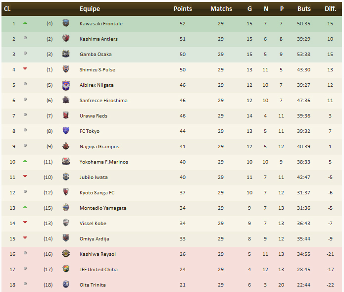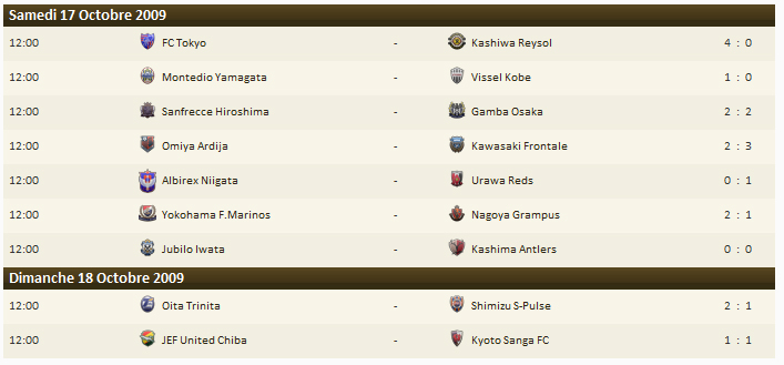 Ce qu’il faut retenir : Sensation ce week-end : Shimizu s’incline à la surprise générale à Oita, lanterne rouge du classement et relance ainsi le championnat. Ils sont désormais quatre à pouvoir espérer conquérir le titre 2009. Dans ce chassé croisé, la bonne opération revient au Frontale. Quatrièmes avant cette 29e journée, Kawasaki s’impose à Omiya et dépasse Kashima et Gamba, tous deux tenus en échec en déplacement. Shimizu chute à la quatrième place mais avec 2 points de retard à 5 journées de la fin, difficile de prévoir le dénouement de cette J-league. Dans la lutte pour le maintien, si l’affaire est quasi conclue pour Oita, JEF United et Kashiwa, balayé à Tokyo (4-0) voient le wagon de la seconde division se rapprocher de plus en plus.Le classement :