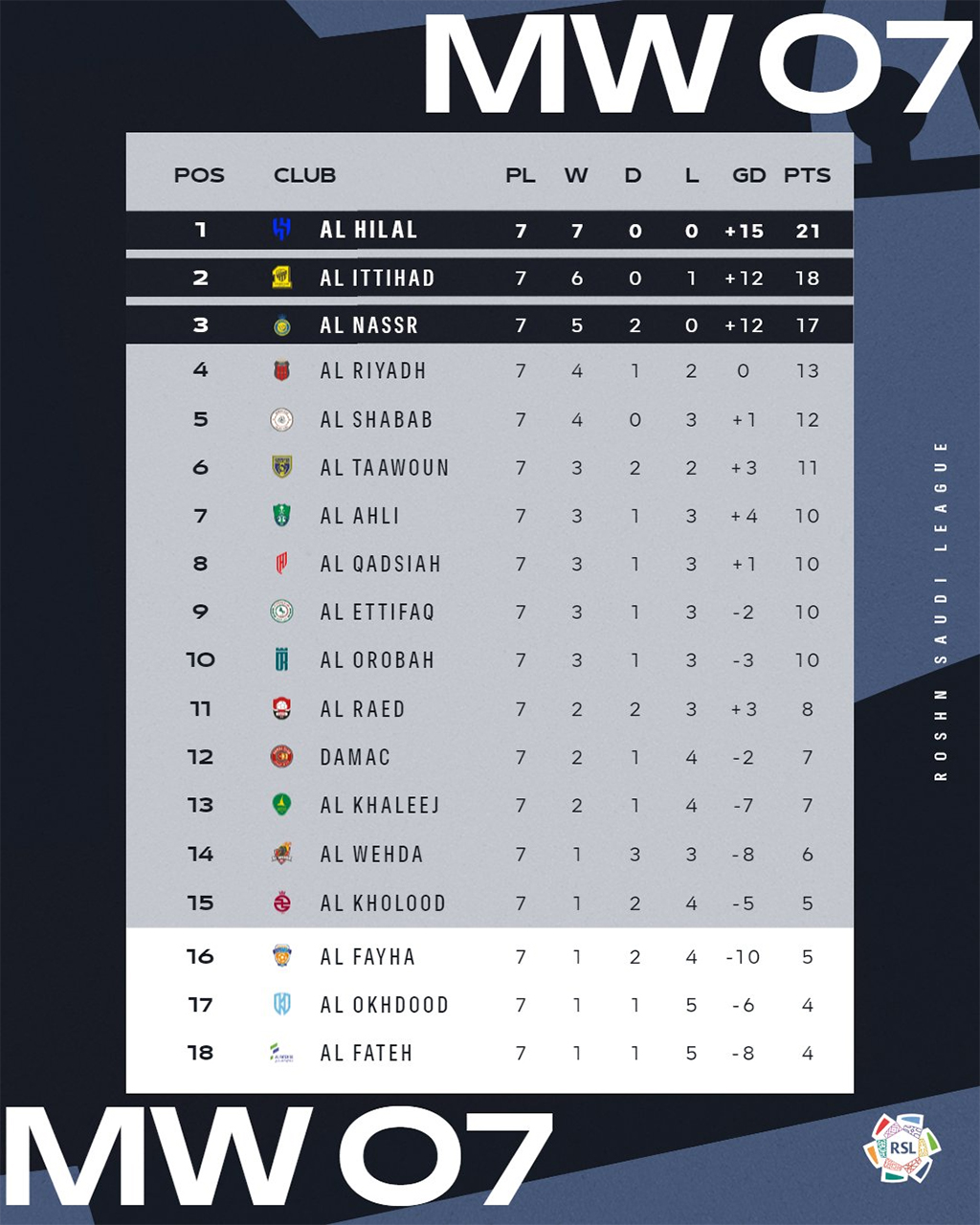 Sept victoires, vingt-et-un points pris sur vingt-et-un possibles, Al-Hilal semble bien parti pour offrir une saison de légende. Très bien gérée, l’équipe n’a que peu évolué cet été, offrant une stabilité nécessaire pour bien démarrer la saison. Avec dix pions plantés en cinq doublés, le Serbe Aleksandar Mitrović semble parti pour lui aussi casser tous les compteurs. Ses deux buts contre Al-Ahli ont permis à Al-Hilal de l’emporter dans la douleur. Car malgré des résultats comptables excellents et une solide différence de but de +15, les Bleu et Blanc semblent peut-être un peu moins dominateurs. Contre Damac, le match, finalement remporté trois buts à deux, avait failli leur échapper. Alors que le retour de Neymar approche, les hommes de Jorge Jesus ont déjà passé avec succès le test Al-Fayha (3-0), le prochain est prévu face à Al-Taawoun avant le match le plus attendu de la saison, le derby contre Al-Nassr.