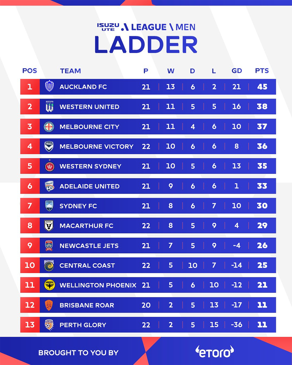 La A-League illustre parfaitement la dynamique du football australien, oscillant entre compétitivité accrue et imprévisibilité chronique. Car à quelques journées de la fin, Western United, deuxième, n’a que seulement neuf points d’avance de Macarthur, huitième.