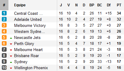 Contraint au nul face aux Victory, le leader Central Coast perd son entraîneur (exclu pour avoir tenu des propos injurieux envers le 4e arbitre) et voit revenir sur lui les Reds. Adelaïde s’impose en effet chez lui devant Perth grâce à un doublé de Jeronimo Neumann non sans s’être fait peur en fin de rencontre. Conséquence comptable : les deux leaders se tiennent de nouveau en deux points.