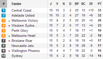 Derrière le duo, qui a creusé l’écart, les Victory, forts de leurs trois victoires en quatre match, et la grande surprise du début de saison Western Sydney ont pris position et également creusé des écarts sur les autres clubs de A-league. Parmi les premiers lâchés, Perth et les Heart restent sous la menace du duo Brisbane – Newcastle (deux points séparent ces quatre équipes) pendant que Wellington (à trois points) et Sydney ferment la marche.