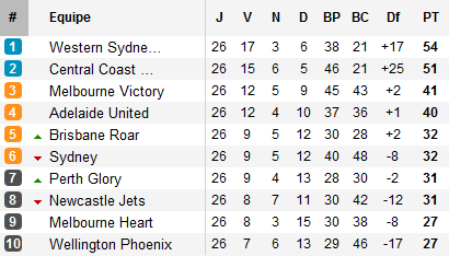 Devant, les Wanderers n’ont pas encore assuré la première place. Accrochés dans un superbe derby de Sydney par les Sky Blues de Del Piero, les hommes de Popović devront prendre un point lors de l’ultime journée pour assurer la première place de la phase régulière. Car juste derrière eux, les favoris d’avant-saison Central Coast n’ont pas encore abdiqué. Les Mariners s’imposent à Adelaïde (avec notamment un but de l’ancien lillois Mike Sterjovski sur son premier ballon touché). Trois points séparent ces deux équipes qui sont au minimum assurés de disputer les demi-finales.