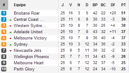 La défaite des Wanderers, qui joueront les Roar la semaine prochaine, offre également aux Reds d’Adelaïde l’occasion d’espérer venir attraper la deuxième place sur le fil. En déplacement à Wellington, Adelaïde s’impose sur le score minimal mais revient ainsi sur Melbourne Victory, accroché chez lui par les Sky Blues de Sydney, à deux points de Central Coast. A deux journées de la fin, quatre équipes se tiennent en deux points et lutteront pour la deuxième place synonyme de demi-finale alors que derrière, Sydney et Newcastle, tombé à Perth pour ce qui pourrait bien être la dernière de l’aventure australienne de Wiliam Gallas, sorti sur blessure, lutteront pour la dernière place en play-offs. Sur le papier, les Sky Blues ont un calendrier plus facile avec deux réceptions de deux équipes déjà en vacances : Wellington et Perth.