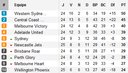 Toute la question est donc désormais de savoir si Central Coast parviendra à tenir la seconde place, elle aussi qualificative pour les demies. Les Mariners, tombés chez eux face aux Wanderers, tombent une nouvelle fois cette semaine en s’inclinant chez l’irrégulier Sydney FC. Conséquence, longtemps leader, Central Coast est désormais à cinq points du leader et compte cinq points d’avance sur le troisième.