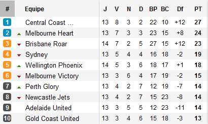 Pendant que Central Coast était ralenti à Gold Coast, ses poursuivants en profitaient pour revenir au classement. Au premier rang desquels l'autre club de Melbourne : les Heart.