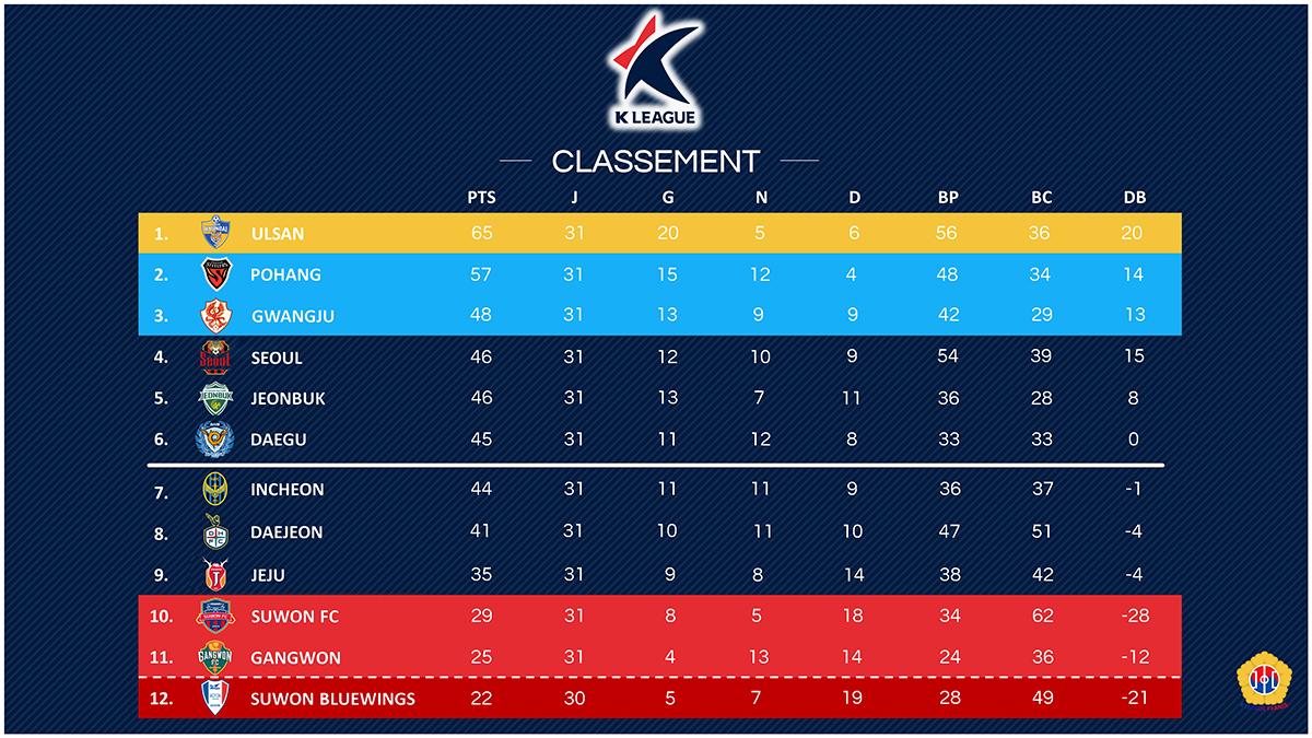 Si Daejeon veut continuer de croire au top 6, aucune erreur n'est permise sur les derniers matchs de la première phase. Affronter de tristes Bluewings, toujours bon dernier, était donc l'occasion de renouer avec la victoire et rester au contact. Chose faite puisque les Citizens se sont largement imposés malgré encore une rotation dans l'effectif afin de reposer certains joueurs. Rapidement, Kim In-gyun ouvrait le score profitant d'une défense absente des Bluewings. Puis, les espaces dans les lignes arrière de la lanterne rouge profitaient à Yu Kang-hyun qui se jouait de Yang Hyung-mo pour doubler la mise et saisissait la chance que lui offre son entraîneur de briller. Juste avant la pause, les Bluewings se voyaient en position de réduire l'écart mais Lee Chang-geun sortait le pénalty de An Byong-jun. En seconde période, la réduction de l'écart arrivait grâce à Kozuka Kazuki d'une superbe frappe. Mais un retour au score qui n'était pas suivi par d'autres opportunités franches et en fin de rencontre, Thiago Orobó inscrivait un troisième but sur pénalty (3-1). Daejeon se rapproche ainsi du top six au classement même si les espoirs de voir le promu y terminer sont minces. Avec deux matchs à jouer, il faut combler un retard de quatre points... Dans le bas du classement, les Bluewings sont solidement accrochés à leur dernière place et ne marquent plus de point depuis quatre rencontres. Le premier non relégable, Jeju, est à treize points et le premier barragiste, Gangwon, à trois points.