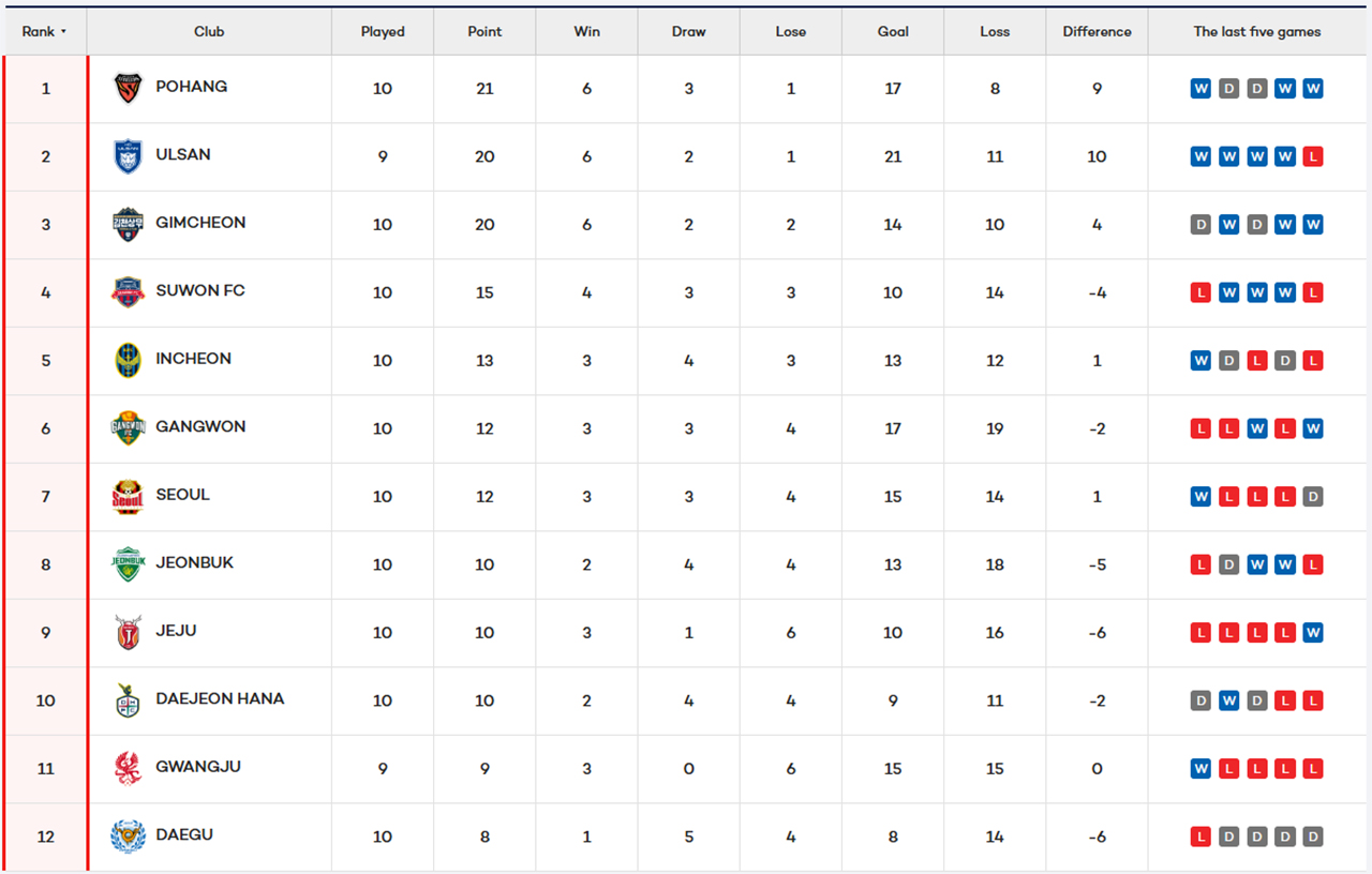 Avec l’ambition d’enchaîner après sa première victoire de la saison face au FC Seoul, Daejeon avait fort à faire face à Gimcheon Sangmu, leader avant cette journée. Une rencontre qui se terminait sur un score nul et vierge (0-0) après une prestation moyenne des deux côtés. Un score qui fait perdre la première place aux militaires alors que Daejeon reste dans la zone rouge.