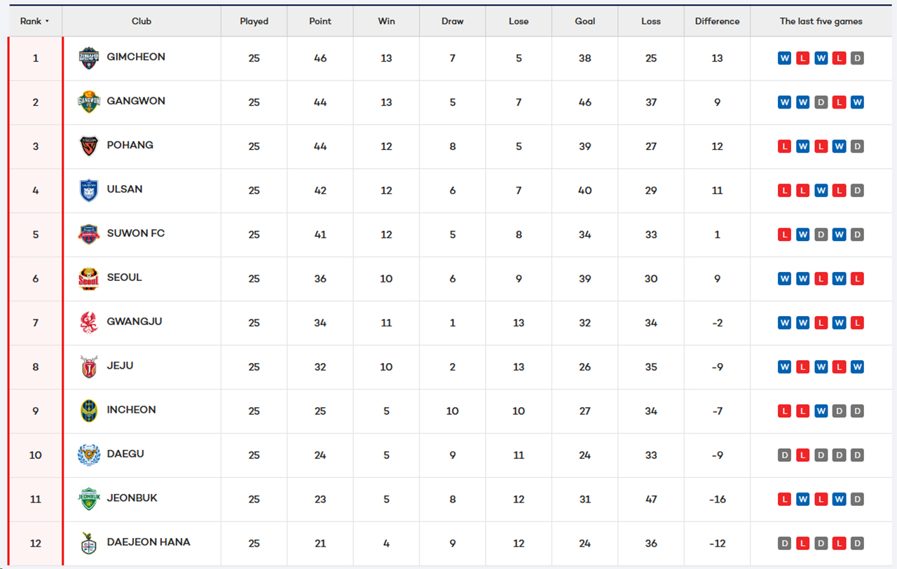 Dans la lutte pour le top 6, Gwangju et Seoul étaient sous la menace de Jeju. Mais les deux clubs ont sur répondre. Gwangju s'est imposé face à Suwon FC alors que Seoul a remporté le Gyeongjin Derby face à Incheon. Seoul, Gwangju et Jeju se tiennent en quatre points pour un billet dans le top 6. Enfin, dans le bas du classement, Daejeon et Daegu n'ont pas su se départager, laissant les Citizens derniers au classement.