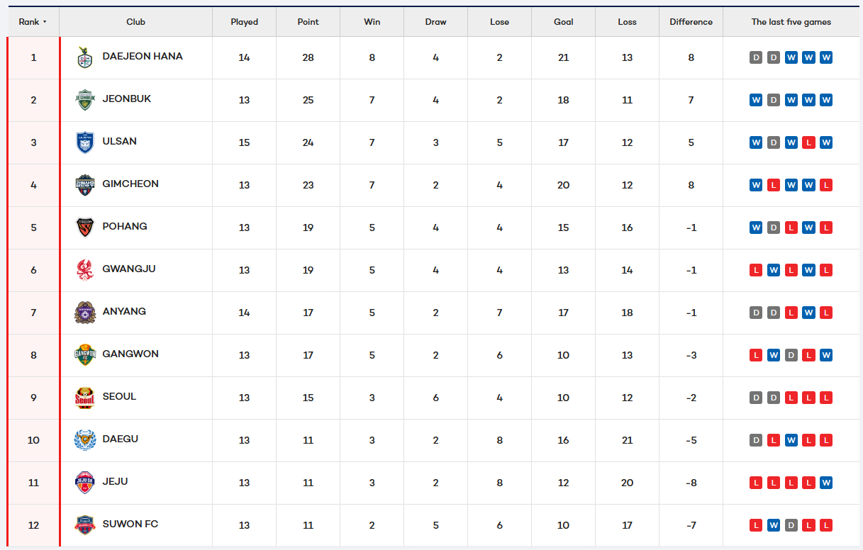 Dans le bas du classement, Daegu quitte la dernière place grâce à son nul face à Anyang (2-2) et la laisse au Suwon FC qui s’est incliné logiquement face à Pohang (0-2). Retour à la case départ. Les Steelers, sans faire de bruit, s’installent dans le top 5.