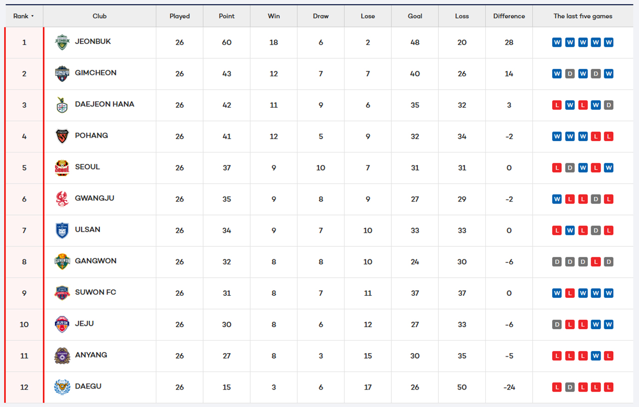 Jeonbuk file droit sur le titre. Tranquilles face à Daegu (3-0), les Green Warriors ont accentué leur avance au classement. De quinze points, elle est désormais passée à dix-sept avec les résultats de ses concurrents. Daejeon s’est en effet pris les pieds dans le tapis face à Gwangju (0-2) et laisse ainsi sa place de dauphin à Gimcheon.