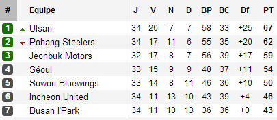 Les Tigres s’imposent à Incheon et signent un quatrième succès consécutif, maintenant la pression sur leurs poursuivants qui s’accrochent : Pohang s’impose à Busan, signant une deuxième victoire de rang. Reste Jeonbuk, toujours en embuscade, à huit points du leader mais avec deux matchs de retard. Pour Seoul, outre la finale de Ligue des Champions retour à gérer en fin de semaine, la course à la qualification pour la prochaine édition s’annonce compliquée, cinq points les séparant des verts.
