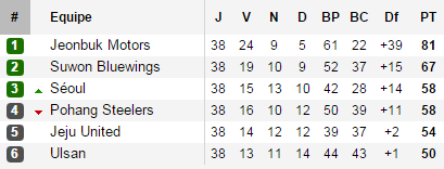 Avec dix points d'avance à sur le second Suwon avant le début des cinq derniers matchs, l'équipe de Jeonbuk n'a pas mis beaucoup de temps pour assurer son titre de champion 2014. Le club a même fait mieux : continuer sa série de victoires consécutives (arrêtée à 9 après le nul de la dernière journée) et conserver son invincibilité (15 matchs, série en cours, à suivre pour la saison 2015). Ainsi Jeonbuk l'a emporté à Séoul (1-0), à Jeju (3-0) ou face à Pohang avec ce fameux penalty joué à 2 (1-0). Jeonbuk remporte ainsi son troisième titre de champion, en 21 ans d'existence. Bien sûr, le club est encore loin des 7 titres de Seongnam ou des 5 titres du FC Séoul et de Pohang Steelers, mais Jeonbuk a le mérite d'être un club qui conserve sa régularité et s'installe durablement dans le football sud-coréen : depuis leur première apparition sur le podium en 2009, le club ne l'a plus quitté.