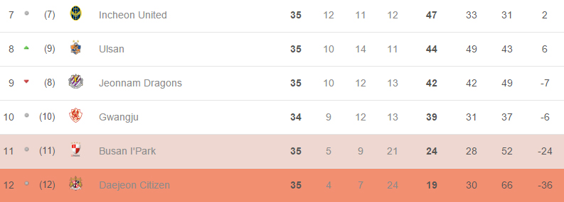 Les deux équipes encore concernées par le maintien sont Daejeon Citizen et Busan. Bien que les deux équipes occupent actuellement -et ce sera le cas jusqu'à la fin- les deux dernières places du classement, l'objectif pour eux est de terminer à la onzième plutôt qu'à la douzième afin de s'offrir un ultime barrage montée/descente contre un club de K-League Challenge. Jusqu'ici, et ce depuis plusieurs mois, c'est toujours Busan qui occupe la onzième place devant Daejeon. Mais la donne pourrait bien s'inverser, puisque Daejeon a remporté ces deux premiers matchs quand Busan n'a pris aucun point. Le dernier match a d'ailleurs été un tournant avec la victoire 2-1 de Daejeon dans leur confrontation, grâce à un doublé de Seo Myeong-Won. Busan avait pourtant ouvert le score. Aujourd'hui Daejeon compte encore 5 points de retard sur Busan alors qu'il en reste encore 9 à prendre. Les Citizens n'ont donc pas leur destin entre les mains, mais ils auraient bien tort de ne pas y croire.