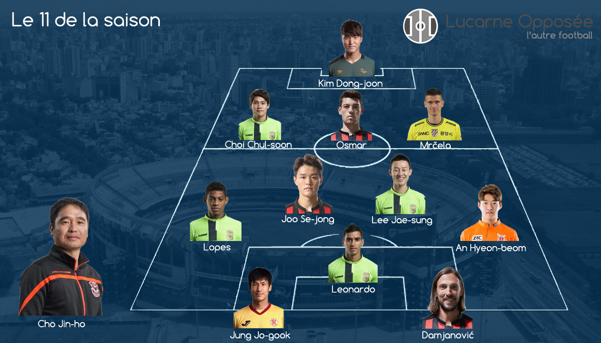 Au poste de gardien but, on retrouve Kim Dong-joon, le jeune portier de Seongnam qui a été bien le seul à surnager. Même si son équipe finit avant dernière, il s'est imposé comme une valeur sûre à seulement 21 ans. Devant lui, une défense à trois avec Choi Chul-soon (Jeonbuk), Osmar (Seoul) et Mrčela (Jeonnam). Au milieu le maître à jouer de Jeonbuk, Lee Jae-sung est épaulé par Joo Se-jong (FC Seoul). Devant, les dynamiteurs de Jeonbuk, Leonardo et Lopes, trouvent parfaitement leur place. Ils sont accompagnés de la révélation de l'année du côté de Jeju, An Hyeon-beom. La pointe est occupée par l'ancien joueur de Nancy, Jung Jo-gook qui termine meilleur buteur du championnat au terme d'une très bonne saison avec Gwangju et accompagne l’inévitable Dejan Damjanović (FC Seoul). Pour mener cette équipe le choix se porte sur Cho Jin-ho. L'entraîneur de Sangju Sangmu a su mener ses militaires dans le groupe de tête à la surprise générale et composer avec une refonte d'effectif au pire des moments (16 joueurs ont quitté Sangju Sangmu en septembre).