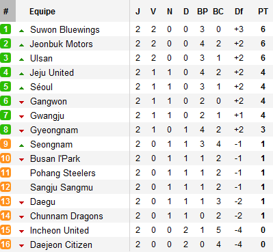 Trois sans-faute au terme des deux premières journées et les favoris annoncés sont déjà en place. Jeonbuk écarte Seongnam en ouverture du championnat et confirme à Daejeon. Pendant ce temps, Suwon et Ulsan remportent leurs deux premiers matchs, Jeju et Séoul pointant à deux longueurs. Seuls favoris à la traîne, Pohang et Seongnam n’ont pris qu’un point en deux rencontres.