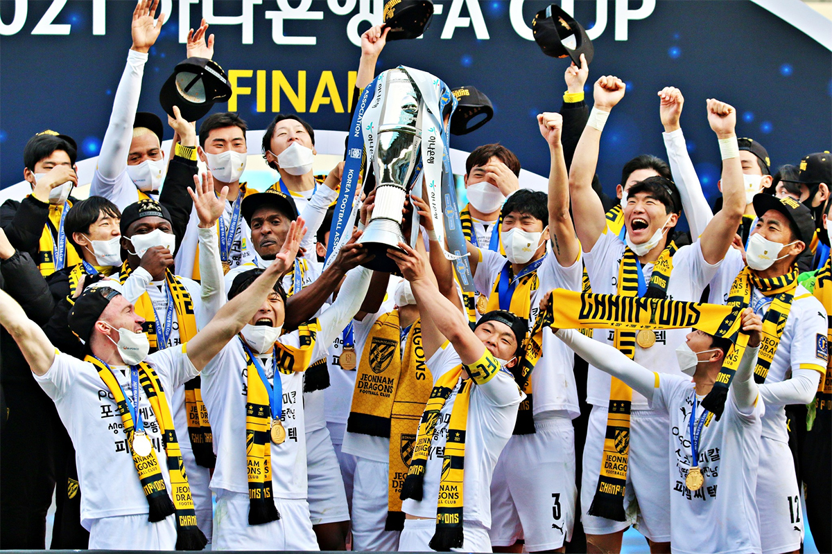 Jeonnam : complètement fou ! Les Dragons, pensionnaires de K League 2, se sont adjugés la FA Cup ce week-end en disposant de Daegu au terme d'un match complètement fou. Après avoir perdu le match aller à domicile (0-1), Jeonnam devait impérativement s'imposer chez les Sky Blues pour décrocher la quatrième coupe de son histoire. Mais en face, Daegu ne souhaitait pas lâcher un second trophée. Ce qui donnait un véritable match de ping-pong puisque chaque équipe se rendait coup pour coup : Jeonnam prenait trois fois les devants alors que Daegu égalisait par trois fois également dans les dix minutes qui suivaient maximum. Le but de Jung Jae-hee pour Jeonnam à la 83' semblait être le dernier mais dans les arrêts de jeu, un pénalty était donné à Daegu pour une faute sur Edgar. Une offrande annulée par le VAR qui empêchait ainsi les Sky Blues de revenir une quatrième fois au score. À la surprise générale, Jeonnam décroche ainsi la FA Cup 2021 et également une place en Asian Champions League 2022. Une première pour un club de K League 2. Jeju, qui espérait une victoire de Daegu pour se qualifier, fait la grimace.