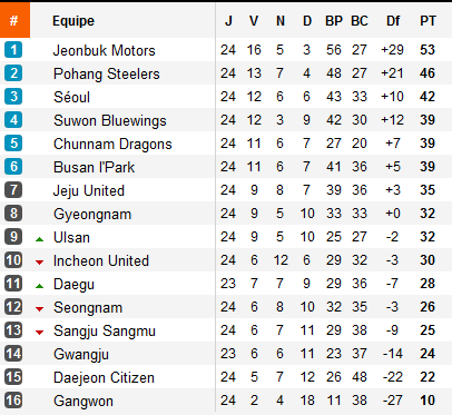Ceux-ci auront cependant profité de la journée pour creuser l’écart avec Seoul dans la lutte qui les oppose pour la seconde place (rappelons le, directement qualificative pour la demi-finale). Car en s’inclinant à Daegu, Seoul a mis fin à sa formidable série de 7 victoires consécutives et se voit désormais relégué à quatre longueurs des Steelers et surtout menacés par le trio Suwon, Chunnam, Busan, tous victorieux ce week-end. Reste le dernier finaliste, Jeju, battu chez lui par Ulsan et qui semble décrocher de cette lutte.