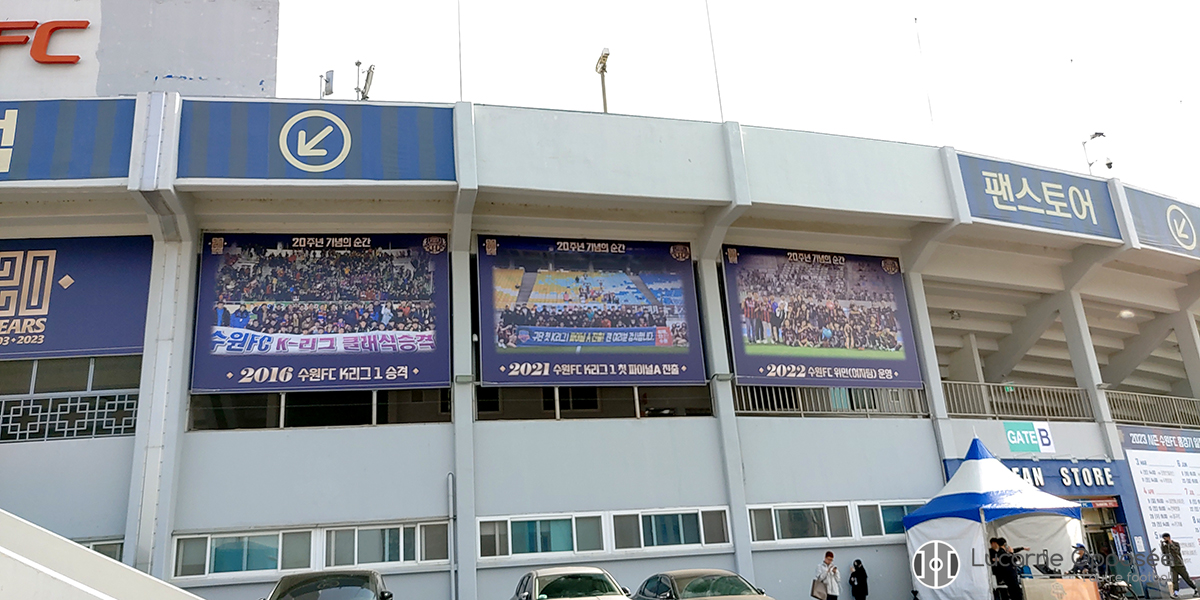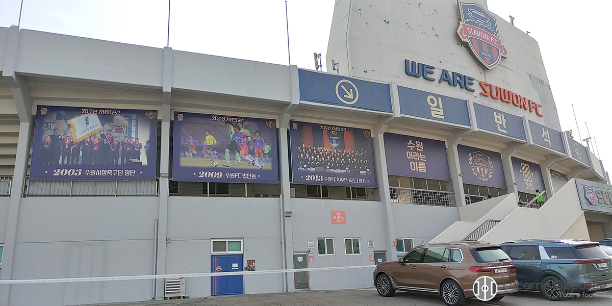 Après avoir déambulé dans les rues de Suwon jusqu'à la forteresse et fait une promenade le long des remparts, nous nous dirigeons vers le stade qui reste tout de même bien caché à la vue de tous. C'est à quelques mètres de celui-ci que nous comprenons enfin qu'il s'agit du stade du Suwon FC puisque quelques drapeaux sont accrochés aux lampadaires afin de célébrer les vingt ans de la création du club. Les premières exclamations d'un match de football se font entendre sur le terrain annexe où deux clubs amateurs se disputent le gain d'une rencontre tandis que nous avançons vers le stade principal. Celui-ci nous accueille avec une grande bannière célébrant, une nouvelle fois, les vingt ans du club. En faisant le tour de l'enceinte, nous arrivons à l'entrée principale qui là aussi décide de rendre hommage à l'équipe en retraçant les moments clefs du Suwon FC, de la création en 2003 en passant par le retour en K League 2 en 2013 puis la première promotion en 2016 jusqu'à s'achever à la saison dernière.