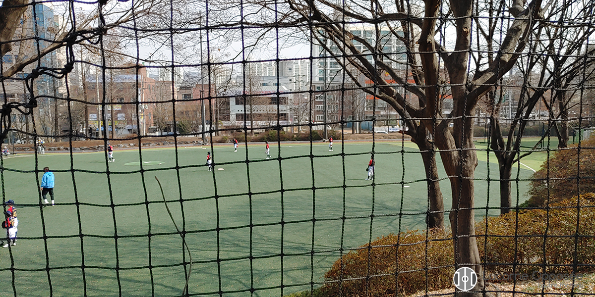 Juste à droite de l'entrée principale se trouve le Fan Store pour acheter les maillots et les quelques goodies à l'effigie du club. Une boutique à la surface limitée qui fait vite le plein au moment de son ouverture deux heures avant le match. Le constat est identique à la fin de la rencontre, les supporters prennent d'assaut ce petit magasin. Nous sommes loin d'une grosse machine de merchandising et cela se fait sentir. Nous poursuivons notre tour de l'enceinte, à la recherche de quelques points de restauration qui ont généralement leur place aux abords des stades pour nourrir les supporters mais sans succès. Il faut dire que nous marchons essentiellement dans un parking. Nous passons en revanche devant un terrain de baseball où des jeunes enfants s'affrontent surplombés par l'enceinte des KT Wiz, l'un des deux clubs locaux de KBO champion en 2021. Nous passons également devant le gymnase qui accueille les deux équipes de V-League, les Kepco Vixtorm (masculin) et les Hyundai Hillstate (féminin). C'est à peu près tout. Pour se restaurer, il faut donc prévoir d'aller dans un des restaurants à proximité ou bien prendre à emporter.