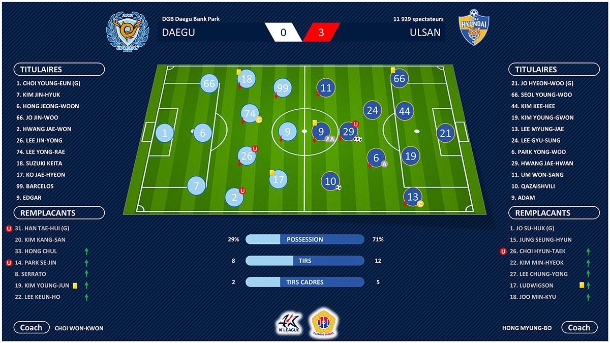 De match, il n'y en a pas vraiment eu puisqu’Ulsan a complètement dominé la rencontre et mis fin à tout suspense dès la première période par l'intermédiaire de Hwang Jae-hwan. D'entrée, il est servi par Martin Adam dans la profondeur pour aller tromper Choi Young-eun (12e, 0-1). A cinq minutes de la pause, Valeri Qazaishvili est bien trop seul à l'entrée de la surface et ajuste parfaitement sa frappe pour faire le break (39e, 0-2) avant que Hwang Jae-hwan vienne conclure une première période prolifique des Tigres (41e, 0-3). Un score large à la pause qui aurait pu l'être encore plus si Um Won-sang n'avait pas trouvé le poteau. En seconde période, Ulsan a contrôlé, laissant un peu plus Daegu jouer mais ni Edgar ni Hong Jeong-woon ne sont parvenus à redonner un poil d'intérêt à la rencontre. Les Tigres s'imposent largement et tranquillement, confortant ainsi leur place de leader au classement. Quant aux Sky Blues, il est toujours difficile d'enchainer deux succès consécutifs cette année et ils restent englués dans la seconde partie du classement.
