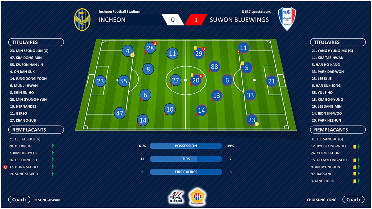 C'est Incheon qui fait le meilleur début de match avec une première offensive de Kim Bo-sub qui trouve le poteau. Mais alors qu'Incheon contrôle, Lee Ki-je ouvre le score sur un coup franc lointain sur lequel Min Seong-jun semble dormir et laisse filer au fond (30e, 0-1). Pour une fois en tête, les Bluewings ne lâchent plus leur avance, faisant complètement déjouer les Durumi et enchainant les fautes pour casser toute possibilité de rythme. Ils sont mêmes les plus proches de faire le break au retour des vestiaires mais cette fois, Min Seong-jun s'interpose. Dans la foulée, Hernandes tente sa chance de loin sans succès. Loin d'être sereins, les Bluewings ont eu l'opportunité par Bassani de faire la différence avant de vivre une fin de match en « sauve qui peut » à chaque incursion d'Incheon. Avec succès puisque la première victoire de la saison est à la clef. Kim Byung-soo a du travail, beaucoup de travail mais récupère une équipe qui a enfin gagné et qui s'est fait du bien mentalement. À suivre néanmoins la nouvelle blessure de Jeon Jin-woo. Pour Incheon, les résultats en dent de scie se poursuivent.