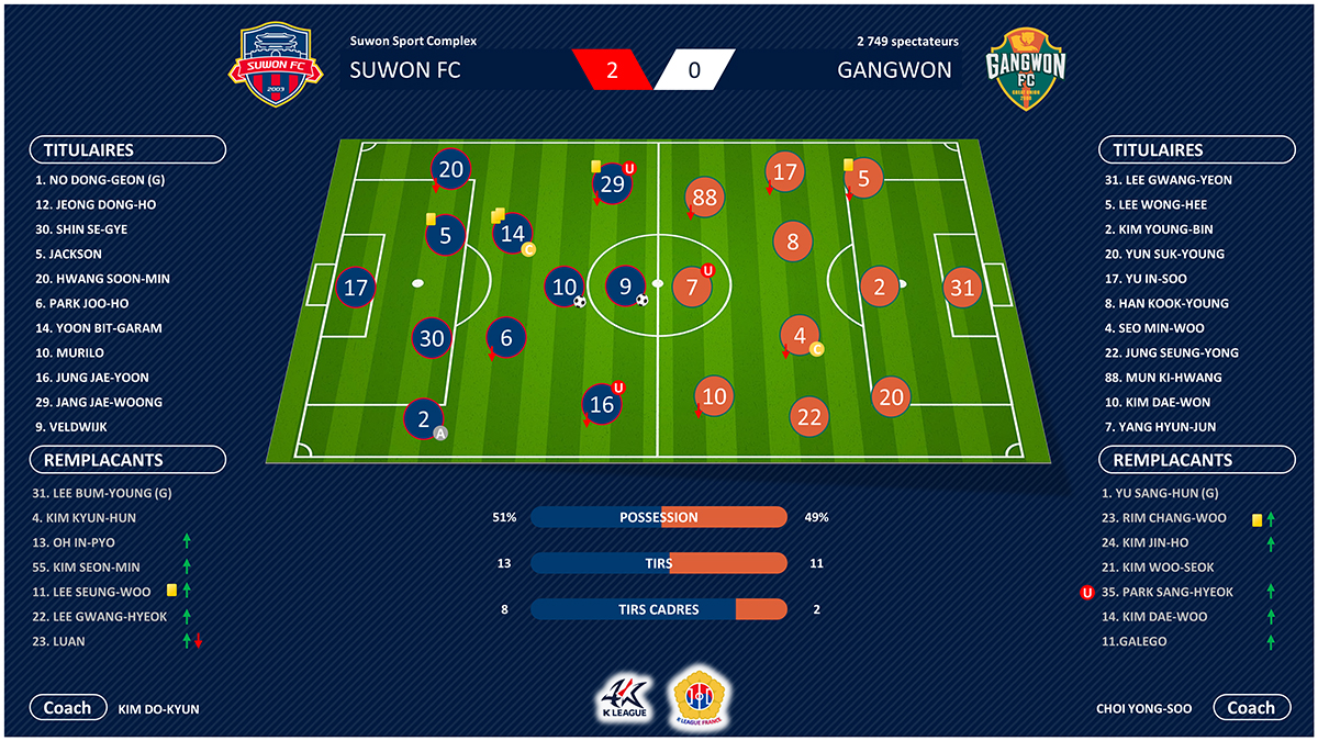Retour à domicile pour le Suwon FC après avoir pris une claque sur la pelouse du FC Seoul la semaine passée. Une semaine suffisante pour enregistrer les retours de Lars Veldwijk (titulaire), Lee Seung-woo et Lee Gwang-hyeok (sur le banc). Néanmoins, Lee Yong (mollet) ne pouvait participer à la rencontre obligeant Kim Do-kyun à revoir son dispositif tactique en 4-3-3. Pour Gangwon, Kim Dae-won et Mun Ki-hwang prenaient place dans le onze de départ au détriment de Kim Dae-woo et Park Sang-hyeok par rapport à la victoire sur Jeonbuk.