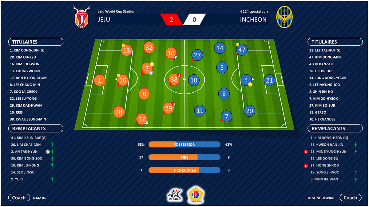 D’entrée de jeu, Jeju annonce la couleur avec un débordement de Ahn Hyeon-beom qui trouve Reis dans la surface. Mais le Brésilien se montre imprécis et manque de peu d’ouvrir le score après seulement quatre minutes de jeu. Dominateur, les Insulaires trouvent la faille dix minutes plus tard par Ahn Hyeon-beom, parfaitement servi par Koo Ja-cheol. L’ailier de Jeju ne tremble pas et place le ballon entre les jambes de Lee Tae-hui (18e, 1-0). Malgré le gain du ballon, Incheon ne trouve aucune solution offensivement et se met en danger face aux contres de Jeju. Au retour des vestiaires, Ahn Hyeon-beom, intenable, déborde de nouveau sur son côté droit et trouve cette fois Yuri. Mais comme son compatriote en début de match, il ne parvient pas à cadrer sa tentative qui fuit le cadre. Incheon réagit peu avant l’heure de jeu par Kim Do-hyeok qui oblige Kim Dong-jun à s’envoler. Dans la foulée, Reis s’essaye à son tour de loin sans succès. Mais le Brésilien ne se décourage pas et est récompensé en fin de rencontre lorsque sa frappe est déviée et termine en pleine lucarne (90e, 2-0). Quatrième succès de suite pour Jeju qui se rapproche du podium alors qu’Incheon tombe dans la zone rouge.
