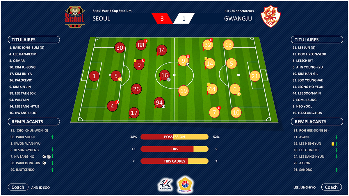 Dès le début du match, Seoul met la pression sur Gwangju et Willyan profite de ne pas être attaqué par la défense adverse pour ouvrir la marque face à son ancien club. Surpris par cette frappe contrée, Lee Jun ne peut rien faire (10e, 1-0). Incapable de réagir, Gwangju manque d’encaisser un second but sur une frappe de Kim Jin-ya mais Lee Jun, en deux temps, préserve l’espoir avant que son poteau ne lui sauve la mise sur une nouvelle frappe lointaine d’Osmar. En difficulté, Gwangju réagit finalement en début de seconde période. Sur une frappe de Lee Gun-hee mal repoussé par Baek Jong-bum, Yeo Hool remet les deux équipes à égalité (51e, 1-1). Un répit de courte durée puisque dix minutes plus tard, Kim Han-gil se laisse surprendre par Willyan qui récupère le ballon à l’entrée de la surface, sert Hwang Ui-jo qui adresse un superbe centre pour Na Sang-ho. Formé à Gwangju, ce dernier n’hésite pas et envoie une superbe reprise au fond des filets (66e, 2-1). Sans solution, Gwangju encaisse de nouveau un but de l’un de ses anciens puisque Park Dong-jin inscrit le troisième du FC Seoul sur, encore une fois, une frappe déviée (87e, 3-1). Les Rouge et Noir retrouvent la victoire et se maintiennent au second rang. Pour Gwangju, c’est le cinquième match consécutif sans succès et une chute au classement puisque le promu est désormais huitième.
