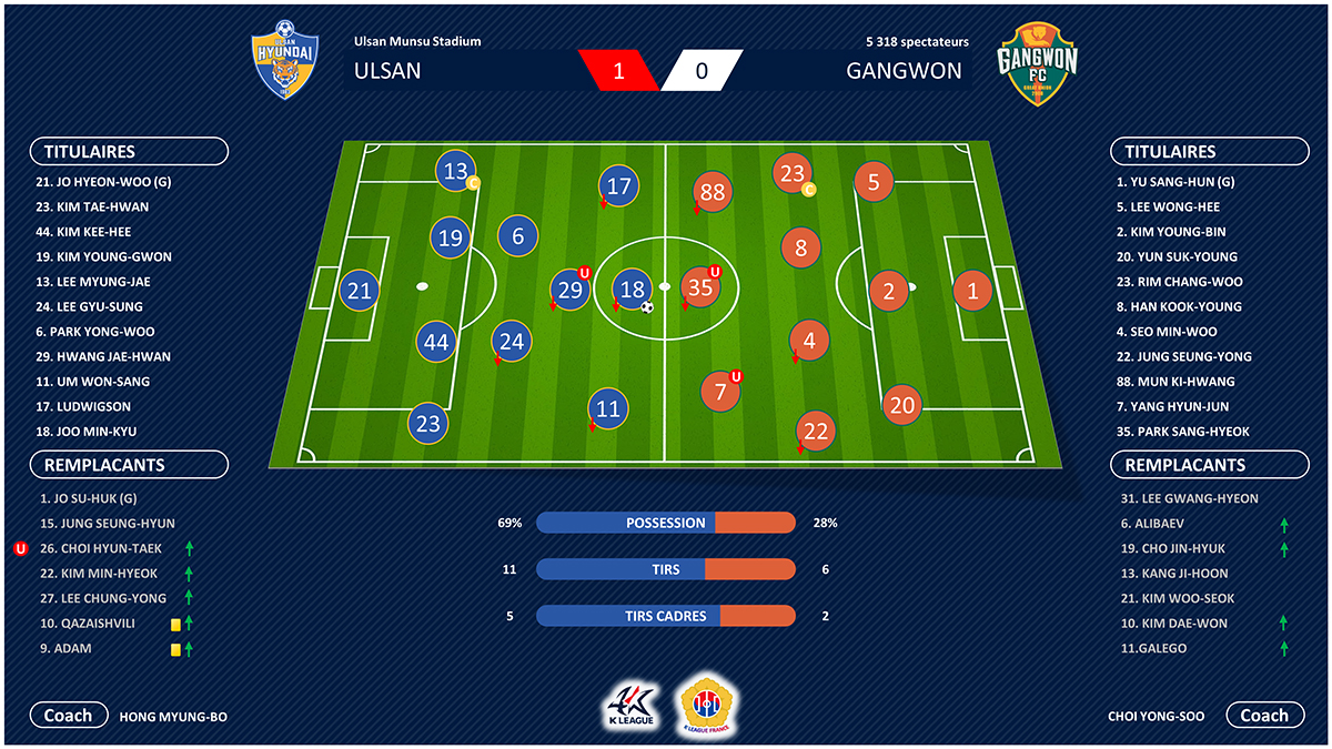 Le match démarre comme attendu avec Ulsan qui domine outrageusement son adversaire sans toutefois mettre le cuir au fond des filets. Moins de réussite que le match précédent pour les Tigres puisque Joo Min-kyu et Park Yong-woo manquent chacun leur tour le cadre. Il faut attendre la seconde période pour voir le match se débloquer sur un pénalty consécutif à une main de Yun Suk-young dans la surface. Joo Min-kyu ne se fait pas prier pour transformer et donner l’avantage à Ulsan (52e, 1-0). Incapable de se montrer dangereux, Gangwon ne reviendra jamais dans la rencontre et peut remercier l’imprécision de Qazaishvili pour ne pas encaisser plus de buts. Un but suffit au bonheur des Tigres qui continuent leur chemin en tête du classement sans se retourner. Après deux victoires de rang, Gangwon enchaine deux défaites de suite et reste avant-dernier du classement à quatre points du premier non relégable.