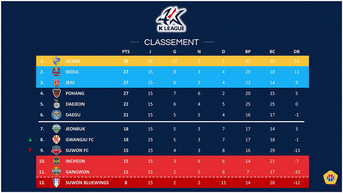 Trop d’erreurs fatales pour le moment côté Bluewings, ce qui les laisse bon dernier. Au contraire, Jeju n’en demandait pas temps et repart de l’avant tout en continuant cette surprenante série de sept matchs sans défaite. Les Insulaires sont toujours troisièmes.