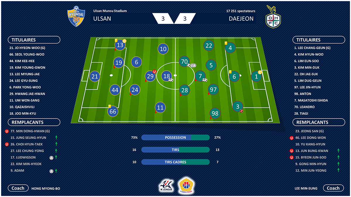 Un superbe match conclu sur un score nul qui n’a que peu d’impact pour Ulsan au classement. En revanche, Daejeon enchaîne un troisième match sans victoire et décroche quelque peu du podium.