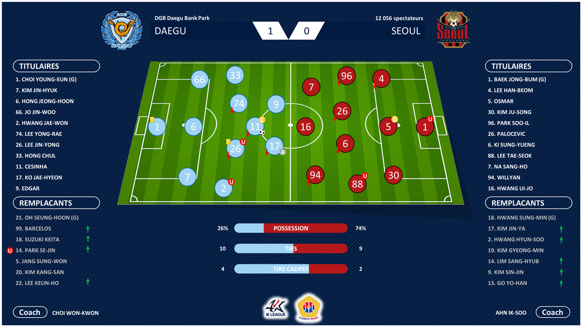 Une rencontre qui se déroulait selon les marqueurs habituels de Seoul. Les Rouge et Noir conservaient le ballon, sans savoir trop quoi en faire tout en étant léger défensivement, permettant à l'adversaire de prendre les devants. Ainsi, après avoir eu le ballon pendant vingt pour cent du temps dans le premier quart d'heure, Daegu se retrouvait en tête grâce à superbe frappe de Cesinha, bien trouvé par Ko Jae-hyeong (15e, 1-0). Quelques minutes plus tard, profitant toujours d'une défense approximative de Seoul, Daegu manquait le break par Edagar. Le Brésilien, seul au second poteau, envoyait sa tentative dans les nuages plutôt que dans le but vide. Seoul ne réagissait pas, continuant son traditionnel plan de jeu bien trop simple à défendre par les Sky Blues. Ces derniers opéraient en contre et manquaient de nouveau la balle du second but par Hong Chul. Finalement, Seoul s'offrait sa première occasion juste avant la pause visa Osmar de la tête. Mais l'Espagnol ne cadrait pas sa tentative. Toujours dominé sans la possession, Daegu se montrait plus facilement dangereux et il ne fallait qu'un réflexe de Baek Jong-beom pour garder Seoul en vie. Jamais inquiétés, les Sky blues s'imposaient pour garder cette série d'invincibilité et une place dans le top 6. Côté Seoul, le club retombe dans ses travers progressivement et doit réagir pour retrouver le visage du début de saison. D'autant plus que le club laisse filer sa seconde place.