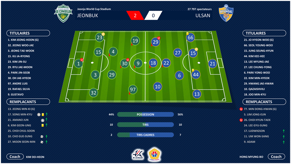 Très ambitieux lors de la première journée face à Ulsan, Jeonbuk l'était beaucoup moins ce samedi. Totalement dominés, les Green Warriors se contentaient de défendre en essayant d'opérer en contre. Mais les Tigres ne trouvaient pas la faille. Qazaishvili et Joo Min-kyu ne trouvant que les gants de Kim Jeong-hoon ou le pied d'un défenseur. Un manque d'efficacité qui permettait à Jeonbuk de rester dans le match et d'y croire malgré la perte d'Andre Luis sur blessure. La seconde période était de même facture avec toujours ce souci d'efficacité qui aurait pu néanmoins être réglé grâce à Ku Ja-ryong proche d'un contre son camp à l'heure de jeu. À force de pousser sans concrétiser, il est arrivé ce qui devait arriver : Ulsan a été puni. Jeongbuk commençait à sortir de sa boîte dans le dernier quart d'heure. Sur un superbe ballon de Amano Jun, Cho Gue-sung plaçait une tête plongeante pour donner l'avantage aux Green Warriors (84e, 1-0). Dans le temps réglementaire, alors qu'Ulsan cherchait à égaliser, Moon Seon-min concluait un contre, bien servi par Song Min-kyu (95e, 2-0). Une victoire importante faisant beaucoup de bien à Jeonbuk qui réduit l'écart avec le podium alors que les Tigres enchaînent un second match sans victoire et connaissent leur seconde défaite de l'année. Pas de péril néanmoins, l'écart avec la seconde place est toujours conséquent.
