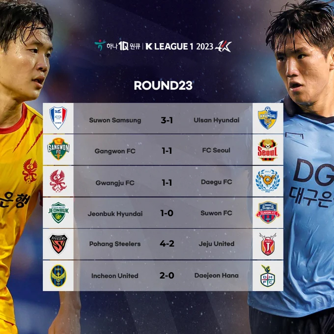 Dure semaine pour Ulsan qui a connu deux revers consécutifs. Le premier face à Incheon en toute fin de rencontre (1-2) et le second face aux Bluewings (3-1). Deux défaites face à des mal classés qui font tache, mais qui ne relancent pas pour autant le suspense en championnat puisque les Tigres ont douze points d’avance. En effet, derrière, les poursuivants n’en ont pas profité. Pohang a d’abord été accroché par les Bluewings (1-1) avant de se reprendre face à Jeju (4-2) tandis que Seoul a écrasé Suwon FC (7-2) avant de concéder le nul face à Gangwon (1-1). Même résultat pour Jeonbuk qui a été tenu en échec par Daejeon (2-2) avant de s’imposer sur le Suwon FC (1-0). À noter également que Jeju poursuit sa lente agonie avec deux nouveaux matchs sans victoires, puisqu’avant la défaite face à Pohang, les Insulaires avaient été tenus en échec par Gwangju (0-0).