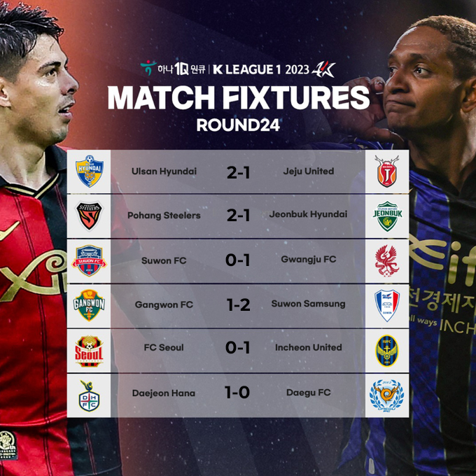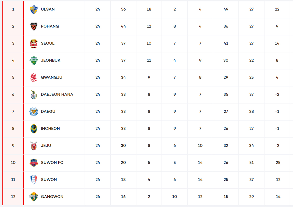 Après deux revers consécutifs, Ulsan a remis la machine en route et s’impose sur Jeju (2-1) qui est encore et toujours en grande souffrance. Dans le choc des poursuivants, Pohang a dominé Jeonbuk (2-1) pour consolider sa place de second. Seoul n’a pas profité de la défaite des Green Warriors pour creuser l’écart puisque les Rouge et Noir se sont inclinés face à Incheon (0-1). La bonne opération est donc pour Gwangju qui se rapproche après avoir dominé le Suwon FC (1-0), lui aussi en perdition. Dans le bas du classement justement, les Bluewings ne sont plus derniers grâce à leur succès sur Gangwon (2-1). Les Bears sont la nouvelle lanterne rouge. Enfin, Daejeon s’impose face à Daegu (1-0) et retrouve le top 6.
