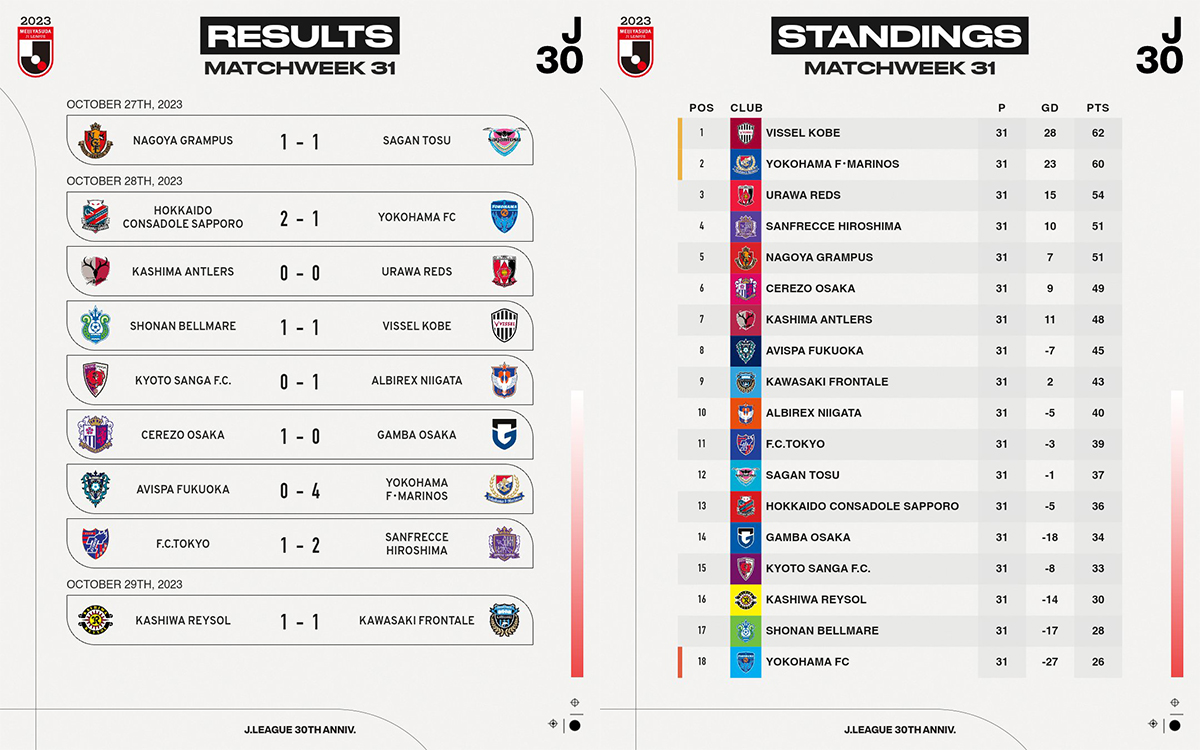 L’ombre de Yokohama F.Marinos plane. Large vainqueur samedi à l’extérieur, les Tricolor se rapproche de Vissel Kobe, tenu en échec. Derrière, la bataille pour la troisième place fait rage alors qu’aux confins du classement, la mauvaise opération est à mettre au crédit de Yokohama FC, défait, mais toujours en position de se sauver.