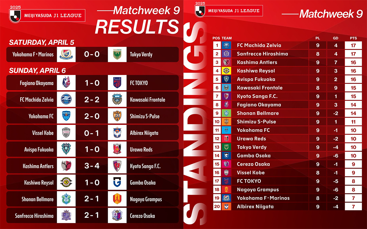 Machida devient le nouveau leader, Kashima chute et Fukuoka enchaine, voici le bilan de la neuvième journée de J1 League 2025.