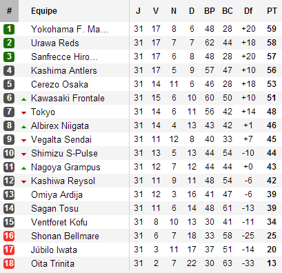 Car devant, les Marinos ont craqué chez eux devant Nagoya, concédant leur première défaite de la saison à domicile au pire des moments. Cette 31e journée aurait en effet pu être celle de Yokohama qui, en cas de succès aurait pu presque définitivement s’envoler vers le titre après les résultats nuls concédés par ses deux poursuivants Urawa et Sanfrecce. Les Reds se font reprendre par Vegalta dans les derniers instants du match alors que le champion sortant sauve le nul chez son prédécesseur Kashiwa.
