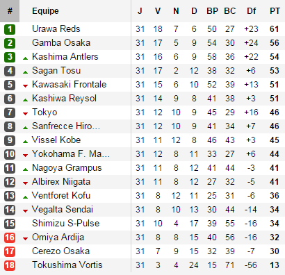 Avec un calendrier compliqué, le leader Urawa Reds devait tout d'abord se déplacer chez les Antlers pour la 30ème journée. Malgré l'ouverture du score des locaux par Caio, Urawa a bien réagi avec un but de Lee, accrochant ainsi le point du match nul. Un point qui ne faisait pas véritablement leurs affaires puisque dans le même temps Gamba l'avait emporté à domicile face au FC Tokyo. Une victoire 2 à 1 qui s'est décidé en un petit peu moins de 13 minutes : Omori a tout d'abord marqué pour Gamba (53') puis Endo a doublé le score six minutes plus tard. Matsuda a réduit le score pour le FC Tokyo quelques minutes plus tard, mais le score ne changera pas. Sur cette 30ème journée, Gamba avait déjà repris deux points à Urawa. Avec seulement trois points d'écart à quelques semaines de leur confrontation directe, la situation semblait idéale pour Gamba Osaka.