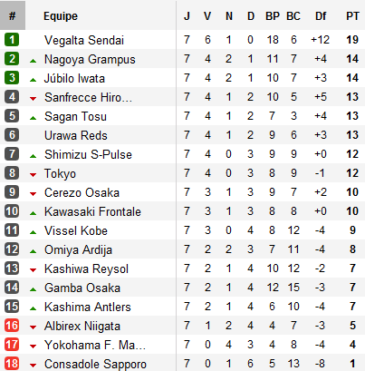 Devant, dans les pas du leader Vegalta, un peloton de neuf équipes se tient en trois points ! Nagoya accroché à Hiroshima par une égalisation in extremis de Ryota Moriwaki, Urawa tombé à Omiya, Shimizu à Gamba et le Cerezo face à Kashima, la belle affaire de la semaine est pour le Júbilo Iwata qui coule l'un des outsiders Yokohama désormais avant dernier et pour le promu Sagan Tosu qui s'impose chez lui devant Niigata sans concéder le moindre but (le promu n'a toujours pas encaissé le moindre but à domicile en cinq matchs joués).