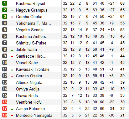 Autre point chaud, la lutte pour le maintien ne concerne désormais plus qu’Urawa et Venforet. Battu à Iwata, Kofu, qui de plus perd son buteur vedette Mike Havenaar expulsé en fin de rencontre, se retrouve à trois points des Reds et n’ont désormais plus d’autre choix que de remporter les deux derniers matchs pour espérer se sauver. La mission n’est pas encore totalement impossible lorsqu’on sait qu’Urawa recevra Kashiwa lors de l’ultime journée.