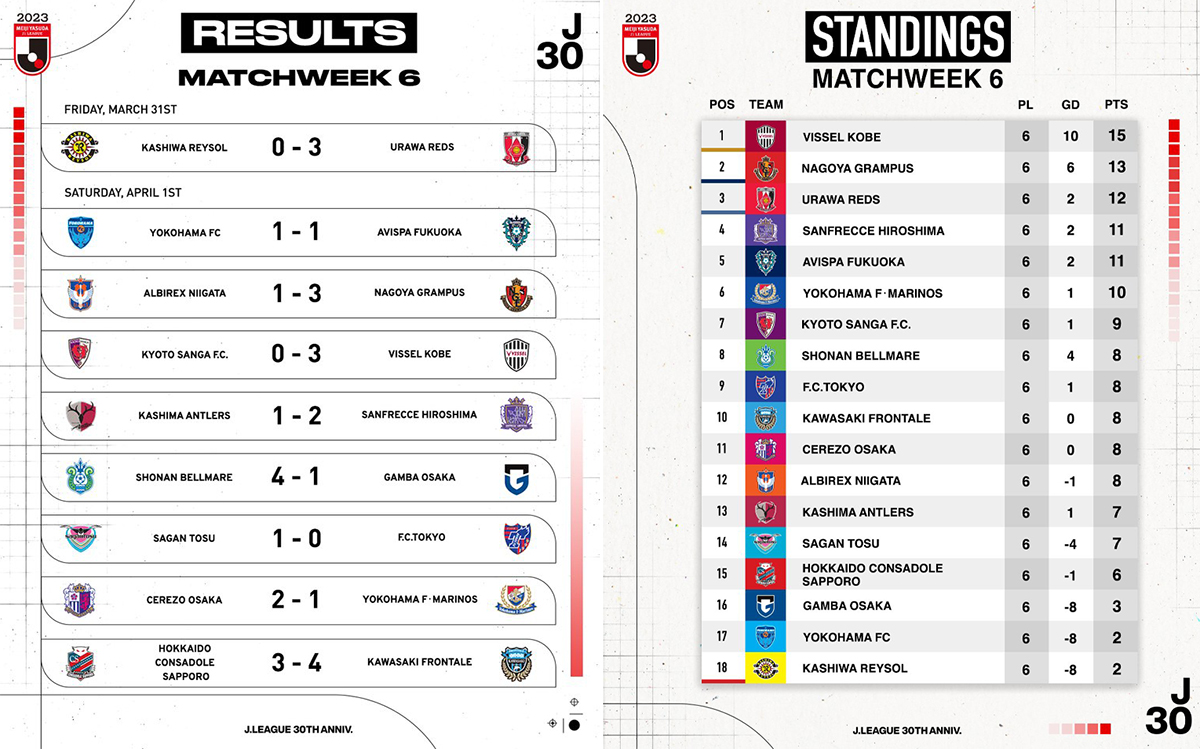 Vissel Kobe enchaine avec une nouvelle victoire à l’extérieur et reste en tête du classement. Urawa Reds l’a imité en ouverture de journée et pointe le bout des crampons sur le podium. Kawasaki Frontale a enfin regoûté à la victoire au terme d’un match fou tandis que Shuto Machino a pulvérisé à lui tout seul et en une mi-temps Gamba Osaka, plus que jamais dans le dur.