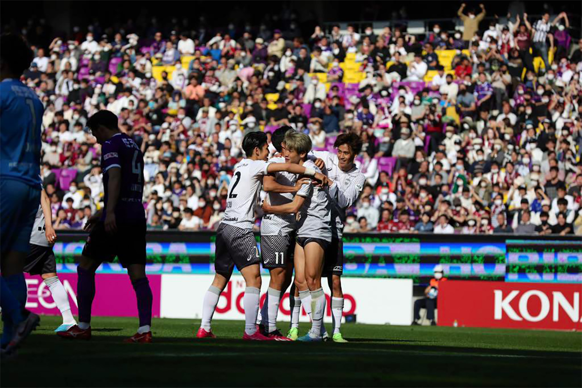 Match du très haut du classement (oui, vous avez bien lu) entre Kyoto Sanga et Vissel Kobe avec des violets qui ont une belle série à poursuivre – trois victoires consécutives – et des grenats qui vont eux chercher à conserver la tête du classement. Au coup d’envoi s’affrontent deux équipes ayant des atouts à faire valoir : les hôtes ont une des défenses les plus solides de ce début de saison tandis que les visiteurs ont la meilleure attaque du championnat. De quoi faire de ce derby un feu d’artifices ? La première période ne laissait rien augurer de tel. Les deux équipes faisaient jeu égal et se créaient chacune une occasion franche – dont un poteau côté pour les vaches – sans faire la différence. La deuxième période était toute autre : Koya Yuruki, auteur d’un début de saison fantomatique malgré une saison 2022 remarquable et mis sur le banc par le jeunot Izumi lors de la journée précédente, sortait de sa léthargie et signait en un quart d’heure un doublé. D’abord en reprenant un ballon mal dégagé aux abords de la surface adverse qui transperçait une forêt de jambes, puis en reprenant finement un centre ras-de-terre de Daiju Sasaki, qui venait de faire son entrée en jeu. Yuya Osako inscrivait tranquillement le dernier but de la partie sur un service XXL de Yoshinori Muto, bien en forme en ce début de saison avec déjà quatre passes décisives recensées. Une victoire finalement maitrisée face à une opposition limitée dans le jeu.