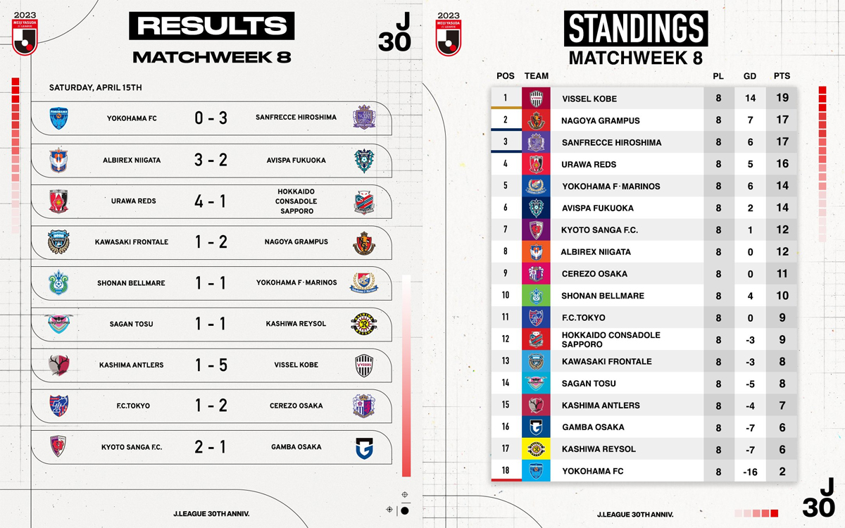 Au pied du podium, on retrouve désormais Urawa Reds après sa démonstration face à Consadole Sapporo. Cette cinquième victoire de la saison a mis du temps à se concrétiser malgré l’infériorité numérique des hiboux intervenue dès la demi-heure de jeu, lorsque Toya Nakamura se faisait expulser en position de dernier défenseur, dépassé par Shinzo Koroki. Alexander Scholz était le premier à faire trembler les filets peu après l’heure de jeu grâce à une montée autoritaire et une belle combinaison avec Takahiro Sekine. Malgré l’expulsion de José Kanté pour sa deuxième apparition sous la tunique rouge, Koroki doublait la mise sur pénalty. En soliste, Daiki Suga parvenait bien à donner un peu d’espoir à Consa mais son équipe était assommée par les buts dans des arrêts de jeu à rallonge de Shunta Tanaka contre son camp puis Marius Höibraten, pour sa première réalisation au Japon (4-1).