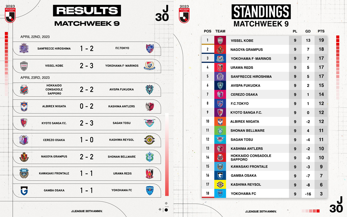 Ça se resserre en haut du classement. Le leader, Vissel Kobe, a été défait mais ses poursuivants directs n’ont pas réussi à faire la différence dans leurs duels respectifs pour les dépasser. Kashima Antlers, en apnée depuis la cinquième journée et quatre défaites consécutives, sort la tête de l’eau en regoutant à la victoire. Une fois n’est pas coutume, quelques décisions arbitrales discutables ont également émaillé cette journée.