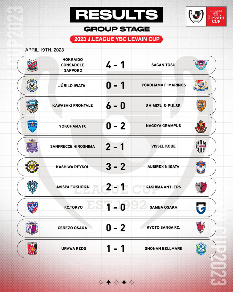 Coupe Levain – 4e journée. On connait déjà les premiers qualifiés pour le tour suivant : Nagoya Grampus et Yokohama F.Marinos poursuivent leur promenade de santé en alignant une quatrième victoire consécutive respectivement face à Yokohama FC (2-0) et à Jubilo Iwata (1-0). On signalera la raclée infligée par Kawasaki Frontale à l’équipe de jeunes de Shimizu S-Pulse (6-0), et celle de Consadole Sapporo face à Sagan Tosu (4-1) avec notamment un doublé de la star thaïlandaise Supachok.
