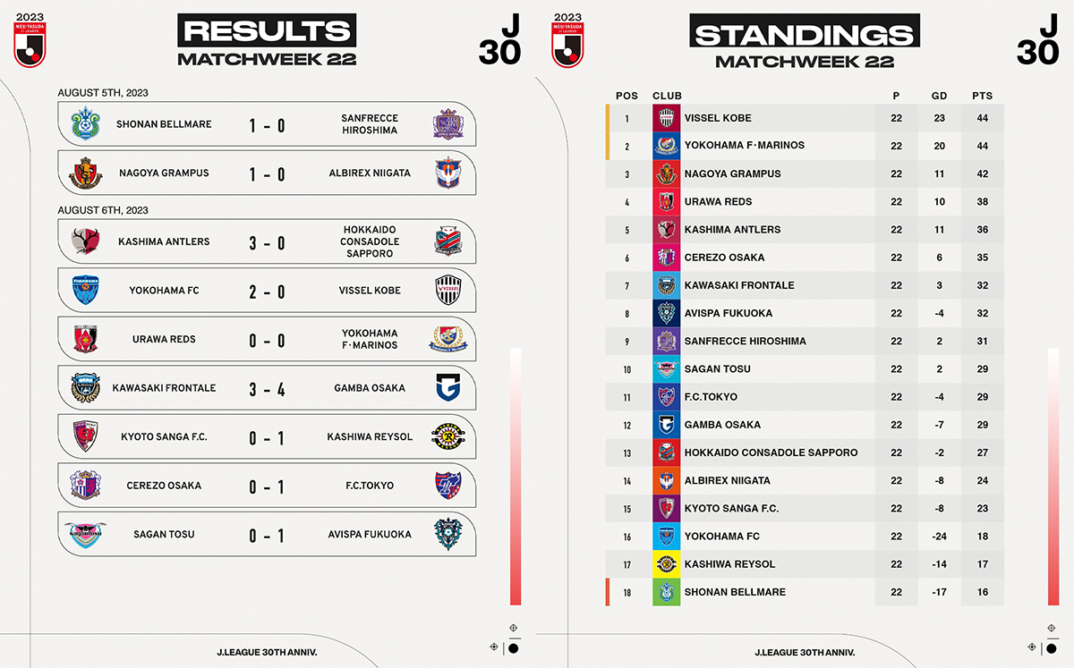 Yokohama FC, Kashiwa Reysol et Shonan Bellmare, en prise à un duel à trois pour ne pas descendre, se sont fait violence pour empocher le maximum de points dans leur quête du maintien. Le suspense reste entier dans le haut du classement avec des résultats contrastés au sein du triumvirat.