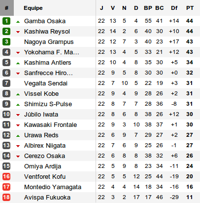 Avec ce succès, Gamba fait coup double. Car la sensation de la 22e journée est venue de Nagoya, battu chez lui par le Vegalta Sendai. Conséquence, Osaka prend les commandes avec Kashiwa qui tient le coup. Le promu écarte dans la douleur son compagnon de montée Avispa Fukuoka, actuelle lanterne rouge et pour qui l'aventure J-league risque de prendre fin d'ici 12 journées. Gamba, Kashiwa, Nagoya, reste une équipe pour compléter ce carré final : Yokohama. Ancien leader, les Marinos restaient sur deux défaites en championnat (contre Kashiwa et Kobe). Opposés au Júbilo Iwata, les Marinos s'imposent grâce à l'un des buts du week-end signé Yuji Ono à 5 minutes du terme de la rencontre. Les Marinos reviennent ainsi à hauteur de Nagoya, à un petit point du duo de tête qui s'affrontera pour l'énorme choc de la 23e journée qui se disputera ce mercredi (L-O espère vous offrir un live à cette occasion).