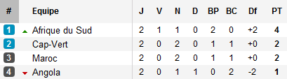 Décevants en ouverture de leur compétition, les Bafanas Bafanas se sont repris face à l’Angola. Une victoire 2-0 qui permet à l’Afrique du Sud de prendre la tête d’un groupe ou tout est encore très ouvert. Car dans l’autre rencontre, la surprise cap-verdienne a réussi à accrocher l’autre outsider du groupe : le Maroc. Un but signé Platini à 10 minutes de la pause que les Requins bleus ont longtemps conservé jusqu’à ce qu’El Arabi ne vienne sauver les Lions de l’Atlas. La troisième journée s’annonce terrible car tout le monde peut encore se qualifier. L’Afrique du Sud n’a besoin que d’un nul, le Cap-Vert peut se qualifier en cas de succès (voire de nul) alors que le Maroc et l’Angola doivent s’imposer pour passer le premier tour.