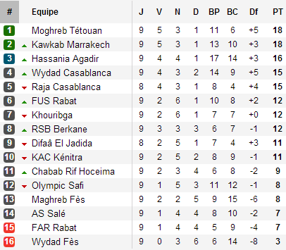 Pendant ce temps, après 9éme journée de BOTOLA, l'étau se resserre en tête de classement avec la victoire du Kawkab de Marrakech sur le leader le MAT (18 pts chacun), ainsi que celle du WAC sur l'OCK 3-1 a une semaine du derby Casablancais face aux malheureux finaliste le Raja. Les deux équipes sont à 15 points chacune avec un match en retard pour les verts ce qui promet un derby foudroyant dimanche prochain. A noter aussi les victoires du Hassania Agadir et du Fus de Rabat qui les placent dans le peloton de tête. Par contre les FAR de Rabat vice-champion l'année précédente n'y arrivent plus. Tenus en échec à Kénitra 0-0 face au KAC, ils pointent désormais à l'avant dernière place avec seulement 7 points sur 27 possible. Autre malheureux le MAS de Fès défait à Rabat face au Fus 0-3 et qui enchaine sa série catastrophique avec seulement 1 pts sur les 6 derniers matchs, très inquiétant pour une équipe qui va représenter le Maroc à partir de Janvier prochain en compétition continentale.